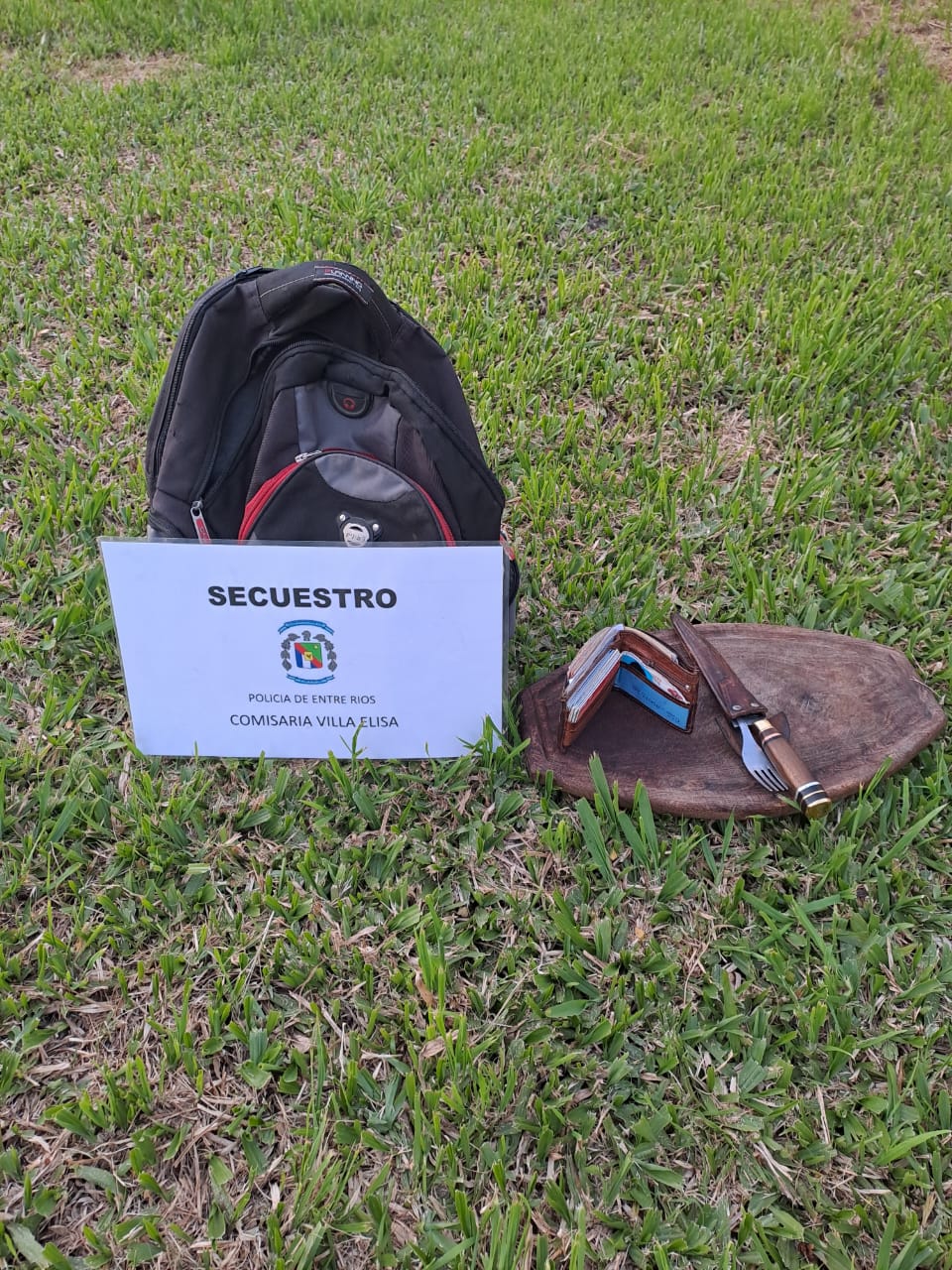 En horas de la tarde, personal de Comisaria Villa Elisa, concurrió a calle Estrada al final , donde se procedió el secuestro de una Mochila, Cuchillos , Tarjetas de Crédito y Débito, elementos que se encontraban abandonados pudiendo establecerse que habían sido hurtados en horas de la mañana a un vecino de esa localidad. Ya con conocimiento de la fiscalía en turno a cargo de la Dra. Noelia Batto, fueron entregados en forma inmediata a su propietario.