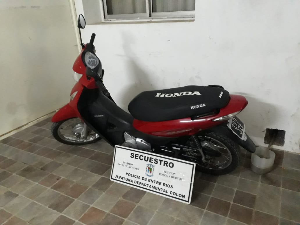 EL PASADO LUNES ALREDEDOR DE LAS 21:30 HORAS PERSONAL POLICIAL DE LA DIVISIÓN INVESTIGACIONES, TOMO CONOCIMIENTO A RAÍZ DE RECIBIR PEDIDO DE COLABORACIÓN POR PARTE DE COMISARÍA SEGUNDA DE CONCEPCIÓN DEL URUGUAY DE UNA MOTOCICLETA SUSTRAÍDA EN SU LOCALIDAD. POR TAL MOTIVO AL REALIZAR AVERIGUACIONES Y UNA ARDUA TAREA INVESTIGATIVA, DIO COMO RESULTADO LA RECUPERACIÓN DE UNA MOTO MARCA HONDA, MODELO BIZ, CON LAS MISMAS CARACTERÍSTICAS A LA DENUNCIADA COMO SUSTRAÍDA EN FECHA 07 DE JUNIO DE 2017 POR UNA CIUDADANA DE CONCEPCIÓN DEL URUGUAY. LA MISMA FUE LOCALIZADA EN UN DOMICILIO DE CALLE CASTELLI AL 500 DE ESTA CIUDAD; EN PODER DE UNA FEMENINA DE 27 AÑOS DE EDAD. SE COMUNICÓ A LA FISCALÍA EN TURNO DE LA CIUDAD DE CONCEPCIÓN DEL URUGUAY QUIEN DISPUSO EL FORMAL SECUESTRO DE DICHO RODADO, QUE LUEGO DE CUMPLIMENTAR DILIGENCIAS LEGALES RESPECTIVAS SERÁ ENTREGADA A SU PROPIETARIA.