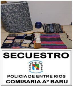 En Horas de la tarde de la víspera, personal de comisaría barú, en el km 192 de la Autovía Gervasio General Artigas, se procedió al formal secuestro de varios elementos que estaban en poder de un masculino de 35 años de edad, oriundo de Misiones, con conocimiento del fiscal de turno, se realizó el secuestro de un colchón de una Plaza, frazadas, cuchillo y un tarro de plástico los cuales habían sido denunciado los primeros días del mes de Abril, en tanto el ciudadano fue trasladado hasta Jefatura Departamental para ser Identificando, quedando supeditado a la causa que se investiga, en cuanto a los elementos fueron entregados a su propietaria.
