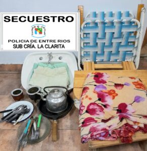 En relación a un hecho delictivo perpetrado en horas de la mañana, personal de Sub cria La clarita, mediante diferentes tareas investigativas, logra el formal secuestro de los elementos denunciados por la damnificada, siendo estos una pileta lavatorio de color blanca, elementos de cocina, una mesa desplegable de pino, toallones, sillón playero, dichos elementos fueron formalmente secuestrados y por disposición de la autoridad judicial interviniente, fueron entregados a su legítimo propietaria.
