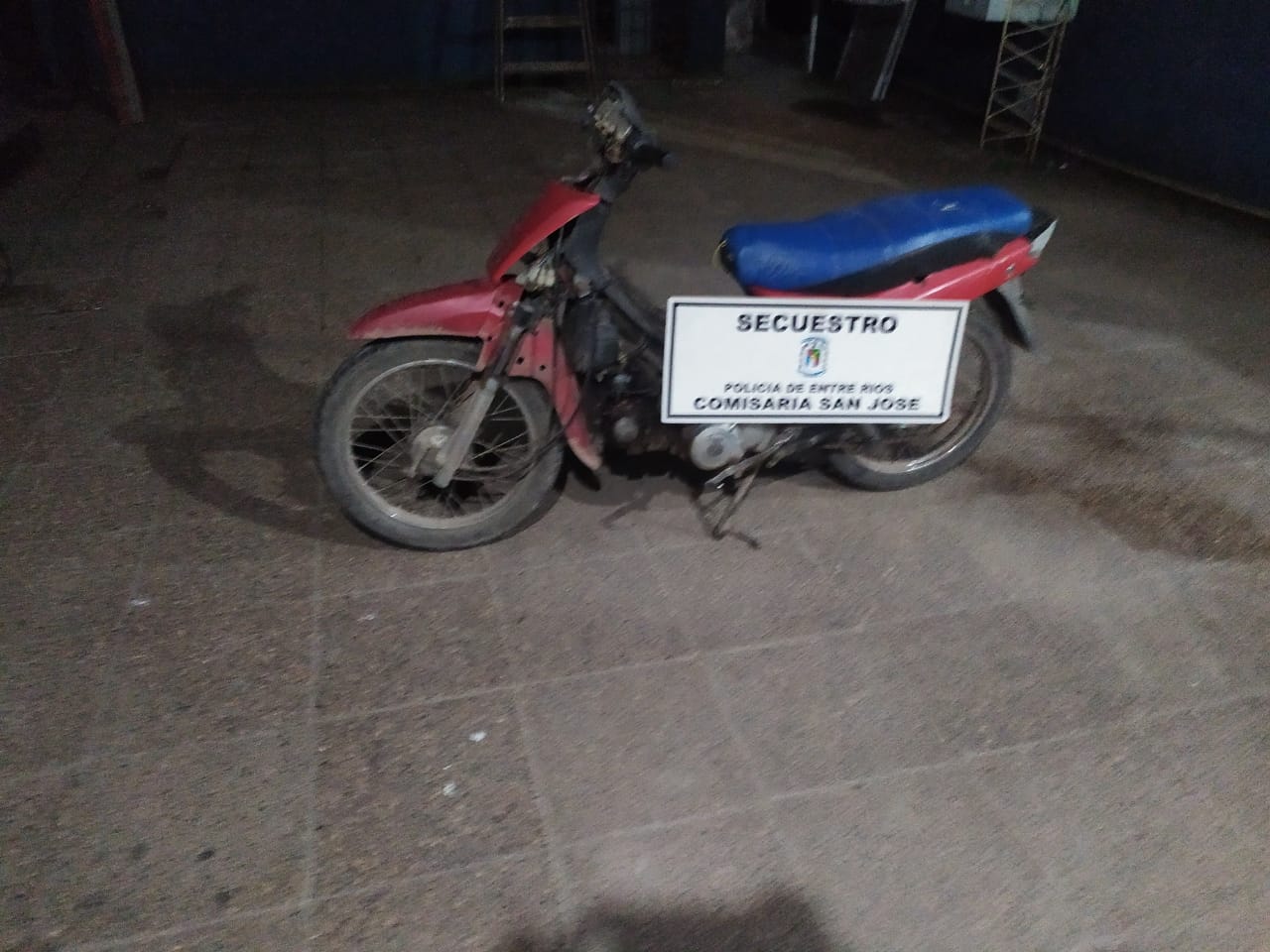Siendo las 20:00hs, Personal de Comisaría San José, se encontraba realizando recorridas en puntos específicos de la ciudad, y logra tomar conocimiento por un llamado anónimo que una motocicleta se encontraba abandonada en intersección de las calles Mitre y Belgrano. Atento a esto se apersonan al lugar y luego de una minuciosa inspección ocular localizan el moto vehículo siendo marca Mondial, modelo 110cc, de color roja , siendo el propietario oriundo de la localidad de Concepción del Uruguay. Procediéndose al secuestro de la misma. Destacando que se iniciaron Actuaciones con conocimiento de la fiscalía en turno a cargo del Dr Perroud Alejandro.