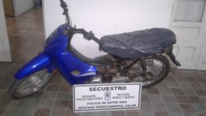 PERSONAL POLICIAL SE HIZO PRESENTE EN UN LOCAL COMERCIAL UBICADO SOBRE AVENIDA PRESIDENTE PERÓN DE LA CIUDAD DE COLON, LUGAR DONDE FUNCIONA UN TALLER, DONDE PROCEDIERON AL FORMAL SECUESTRO DE UNA MOTO MONDIAL QUE HABÍA SIDO DENUNCIADA COMO SUSTRAÍDA EL MES PASADO. SE CONTINÚA CON LA PESQUISA A LOS EFECTOS DE DAR CON LA IDENTIDAD DEL AUTOR DE QUIEN HASTA EL MOMENTO NO SE TIENE DATOS, NI FUERON APORTADOS POR EL PROPIETARIO DEL TALLER, QUIEN ALUDIÓ NO RECORDAR QUIEN SE LA HABÍA ENTREGADO PARA SER REPARADA.