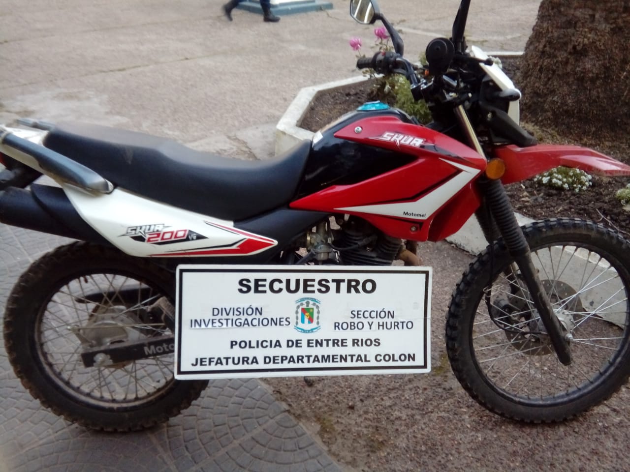 EN LA VÍSPERA PERSONAL DE LA DIVISIÓN INVESTIGACIONES, TRAS REALIZAR RECORRIDOS EN ZONA DE DESCAMPADO, UBICADA SOBRE CALLE MITRE Y LANTELME DE LA CIUDAD DE COLON, LUGAR DONDE SUELEN HALLARSE MOTO PARTES DE DUDOSA PROCEDENCIA, ENCUENTRA ESCONDIDA EN LA MALEZA UNA MOTOCICLETA MARCA MOTOMEL, MODELO SKUA, EN BUEN ESTADO DE CONSERVACIÓN, CON LA MAYORÍA DE SUS PARTES ORIGINALES, CON SU LLAVE DE ARRANQUE COLOCADA. COMUNICADA LA NOVEDAD AL FISCAL DE TURNO INDICA QUE SE INICIEN ACTUACIONES SIMPLES PARA ESTABLECER PROCEDENCIA Y PROPIEDAD, SECUESTRÁNDOSE EL RODADO QUEDANDO A RESGUARDO EN DEPENDENCIA POLICIAL, CONTINUÁNDOSE CON AVERIGUACIONES.