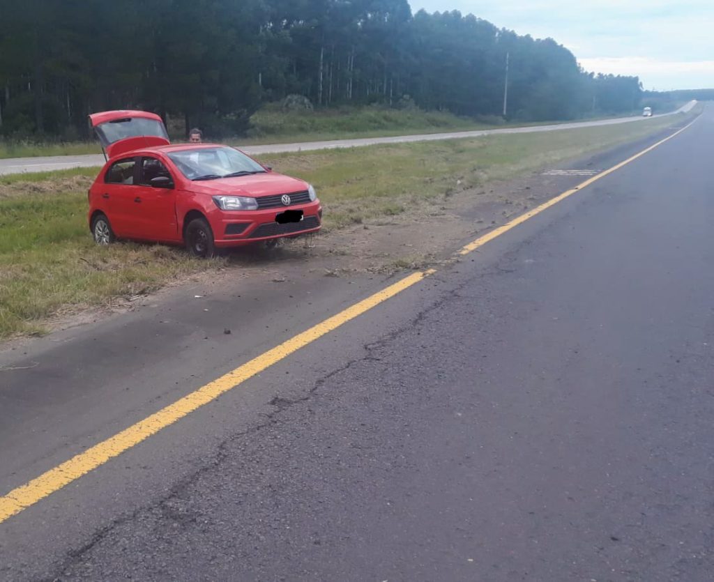A las 08:10 horas de la fecha, personal policial intervino en accidente de tránsito ocurrido en la autovía «José Gervasio Artigas» en el km 193, protagonizado por un automóvil marca Volkswagen, modelo Gol Trend, color rojo, conducido por un ciudadano de 56 años de edad, acompañado por su esposa, ambos domiciliados en Misiones, quienes circulaban en sentido Sur-Norte y por causas a establecer pierde el control del vehículo, saliendo de la cinta asfáltica,habiéndose desbandado ambas cubiertas del lado del conductor.