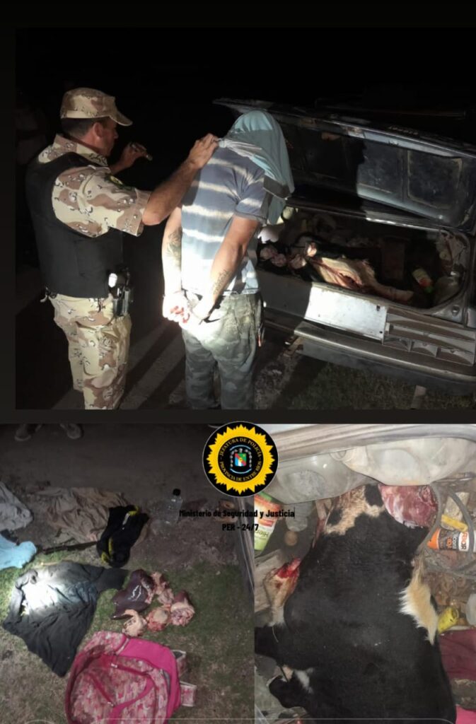 recorrida de prevención por un camino vecinal de Colonia Viraro, Departamento La Paz, en virtud al llamado de un productor rural que ponía en alerta por un vehículo sospechoso en la zona; es que los brigadistas interceptan en dicho camino vecinal un automóvil Marca Peugeot 505, color gris, conducido por un ciudadano de 28 años oriundo del barrio Matadero de la ciudad de Bovril; ante el control policial, los uniformados se llevan la sorpresa que está persona en el baul del rodado llevaba un animal vacuno de categoría ternero, (degollado), sin sus cuatro extremidades y cabeza; además en una mochila tenia las visceras (hígado, corazon, riñones y parte de intestinos); al encontrarse está persona en un evidente estado de nerviosismo y sin poder justificar la procedencia del animal, por ser de un hecho de abigeato; además de tener en su poder envoltorios con marihuana, y bolsas de nylon fraccionados con sustancia blanca, y una importante suma de dinero sin poder precisar de donde la obtuvo.