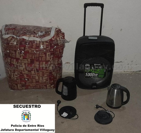 Logrando obtener resultados positivos, siendo las 19:48 horas del Domingo 02 de abril se procedió al formal secuestro de un parlante portátil, un acolchado y dos pavas eléctricas, los cuales se encontraban a pocos metros del edificio escolar, ocultos en la vegetación; se comunicó a la Fiscalía en turno quien dispuso el secuestro de los elementos para posterior entrega de los mismos al damnificado, no obstante ello se continúa con la investigación.-