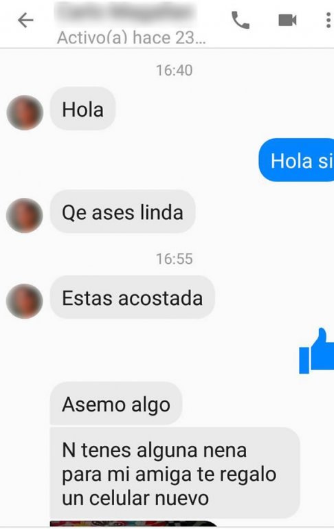Luego, el degenerado volvió a insistir y le ofreció un celular de alta gama a través de una fotografía: “No tenés alguna nena para mí? Si me conseguís una te regalo el celular, queda entre yo y vos”.
