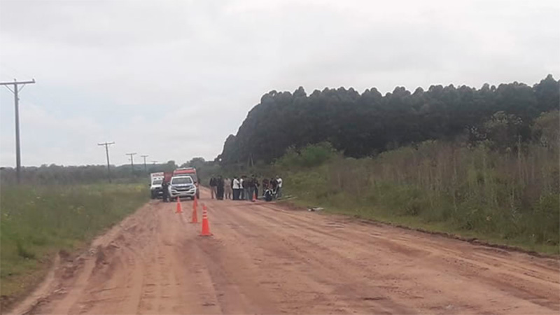 En la fecha siendo las 10:20 horas se recibe un llamado al 101 y se da intervención a comisaria de colonia Yeruá por supuesto accidente de tránsito con una persona de sexo masculino desvanecida en el ripio que une Estación Yeruá y Colonia Yeruá.- En el lugar los funcionarios más precisamente a unos 1500 metros al Este de estación Yeruá se localiza una persona en la banquina junto a una motocicleta marca Yamaha YBR 125 cc, color gris, sin dominio.- Se constata que la persona se encontraba sin vida y que como detalle el tanque de combustible de la motocicleta presentaba lo que podía ser un disparo de arma de fuego.-