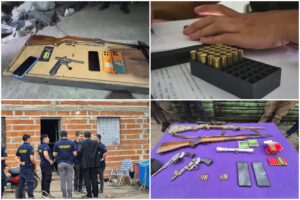 Además, secuestraron 18 armas de fuego: 2 armas de fuego tipo rifle carabina cal 22, 2 armas de fuego tipo rifle carabina cal 22, 1 arma de fuego tipo rifle carabina cal 22, 1 arma de fuego tipo rifle carabina cal 22 (con mira telescópica), 2 armas de fuego tipo revolver cal 38, 1 arma de fuego tipo revolver cal 32, 1 arma de fuego tipo revolver cal 22, 1 arma de fuego tipo revolver cal 32, 1 arma de fuego tipo revolver cal 22, 1 aire comprimido reformado a calibre 22, 1 aire comprimido reformado a calibre 22, 1 aire comprimido reformado a calibre 22, 1 arma de fuego casera o tumbera calibre a determinar, (01) un arma de fuego tipo revolver cal 22, 1 arma pistola 9mm, 1 escopeta calibre 28.