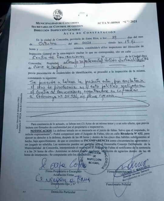 En la parte inferior sólo hay una firma, la de Marcelo Tessani, Director de Inspección General, ya que por la parte infractora nadie dio la cara.El notorio uso de pirotecnia en el acto del PJ originó fuertes críticas en redes sociales. Durante el fin de semana, tomó estado público la reacción de una concejal peronista, Lía Solis, que envió un mensaje de tono discriminatorio hacia un ciudadano que había puesto en evidencia la falta de respeto a las normativas.