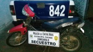 A través de los Operativos que se vienen desarrollando en nuestra Ciudad, la Policía de Comisaria Octava en calles Moulins y Bvard. Yuquerí procedió al formal secuestro de una Moto marca Motomel 110cc; la que pesaba un pedido de secuestro, la misma era conducida por un hombre de 33 años al que luego se lo trasladó a la Jefatura para una correcta identificación.-