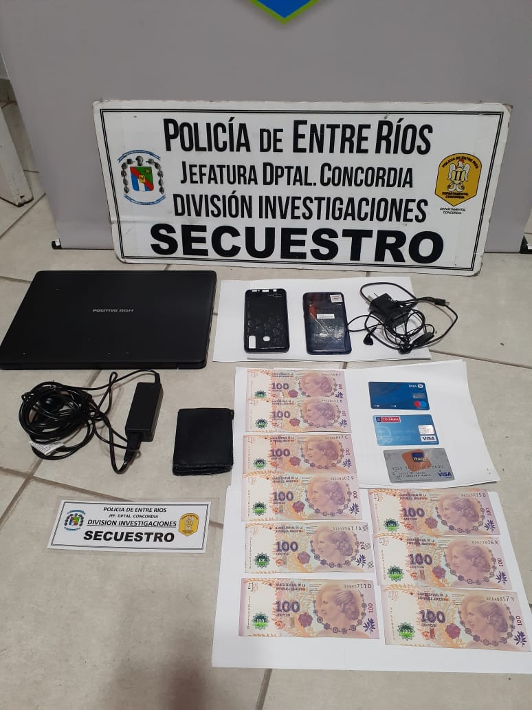Como botín de esta persona a la que también le fue secuestrada es la siguiente: (01) una computadora notebook marca BGH POSITIVO, “nueva”, valuada en ($ 40.000), (01) un teléfono celular Samsung, nuevo, modelo A 30 valuado en (30.000) treinta mil pesos argentinos, tarjetas de débito y crédito de sus víctimas, la suma de $900 Pesos Arg. en efectivo y (01) mochila con ropa.