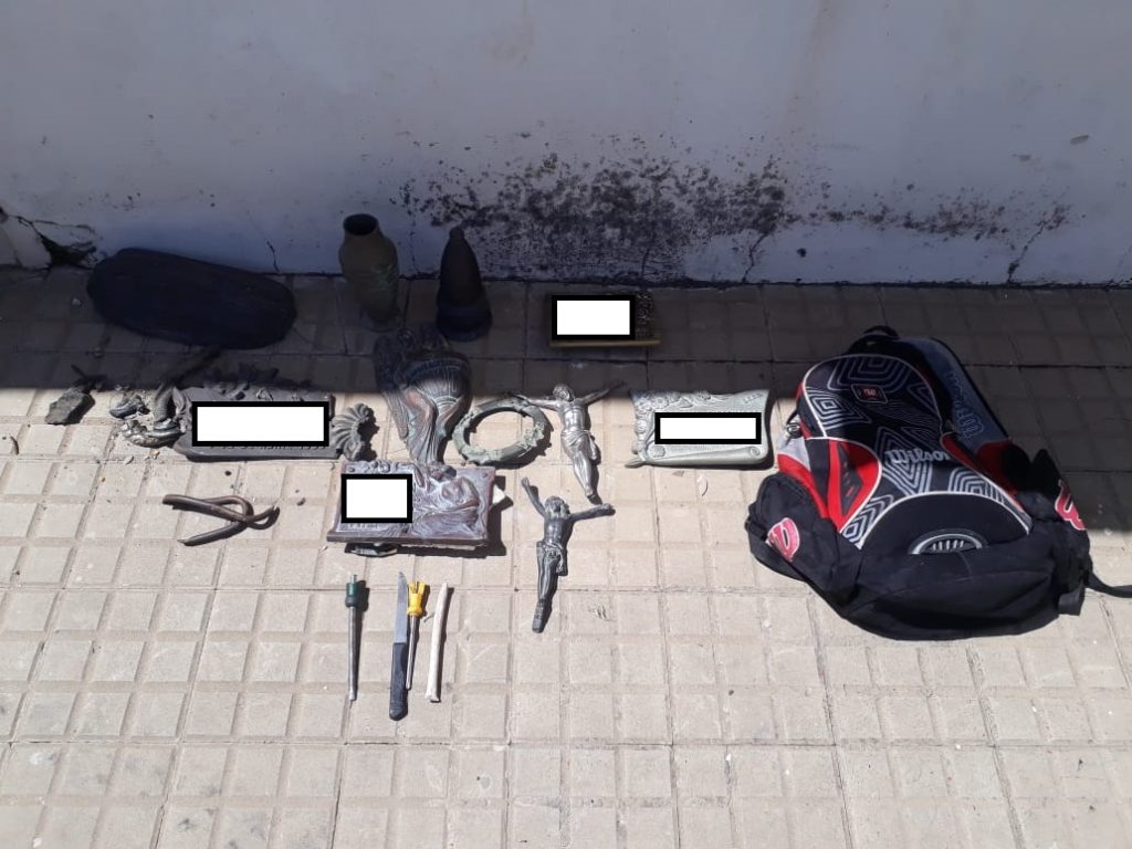 Cuando esta persona se disponía a retirarse por la puerta principal, se lo demoro y se le solicito que exhiba sus pertenencias, situación que puso muy nervioso al sujeto quien luego de unos minutos accedió al pedido de los funcionarios, constatándose que el mismo tenía en el interior de la mochila 04 placas de bronce talladas, 04 jarrones de bronce tallados y 02 estatuillas de bronce de Jesucristo y diversas pertenencias. El Fiscal en turno Dr. Arias, ordeno  la aprehensión del masculino de 37 años, además el secuestro de los elementos mencionados y posterior entrega de los mismos a la encargada del Cementerio.-