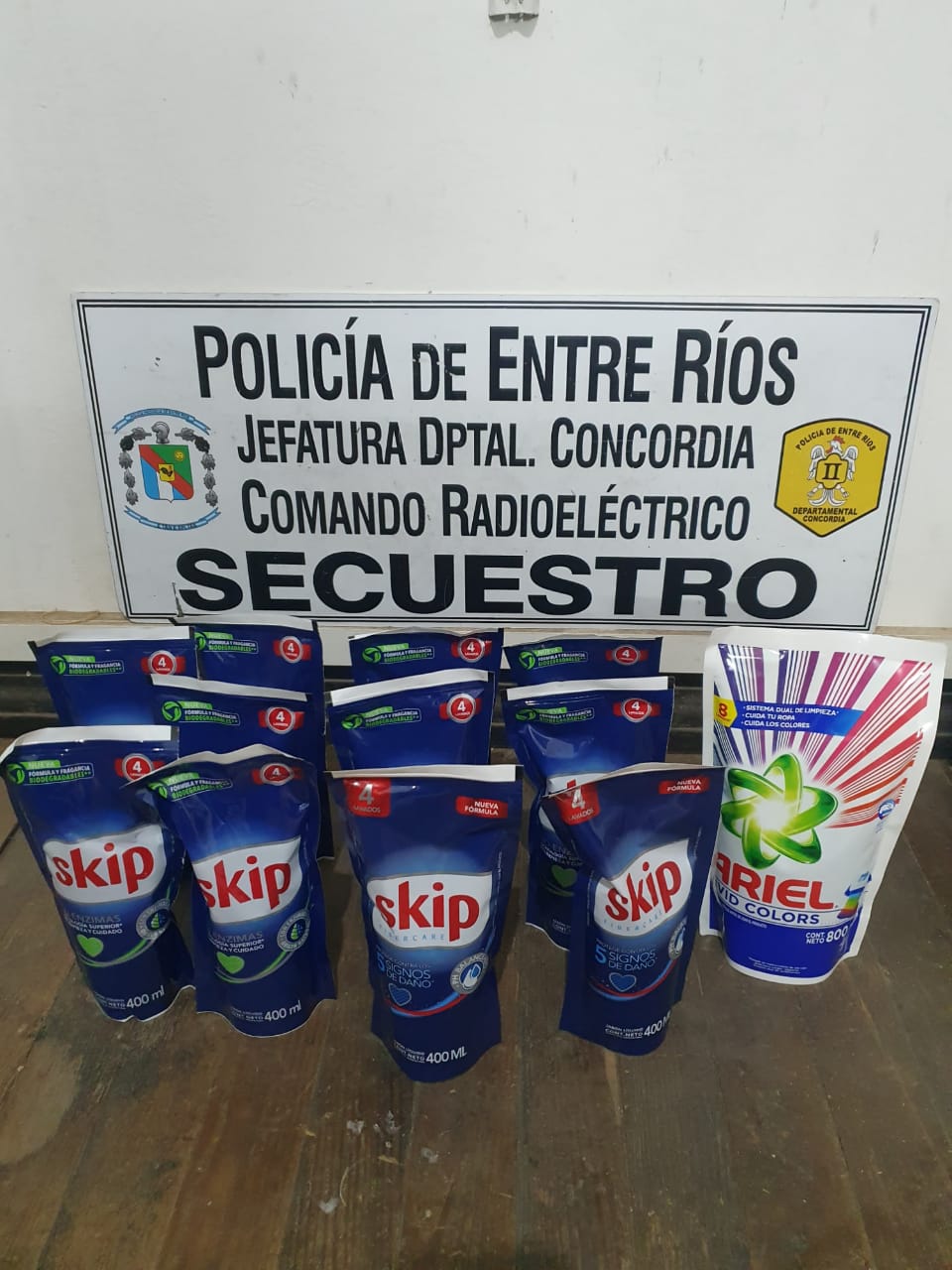 Con los datos aportados por el encargado del negocio, en la intersección de calle D.P.Garat y Corrientes, los funcionarios lograron interceptar a un  individuo de 39 años, quien no tenía en su poder ningún tipo de elemento de dudosa procedencia. Posteriormente otros funcionarios hallaron en calle Rivadavia a escasos metros del comercio una bolsa conteniendo once sachet de 400 ml. de jabón líquido Skip y un sachet de 800ml. de jabón líquido Ariel.