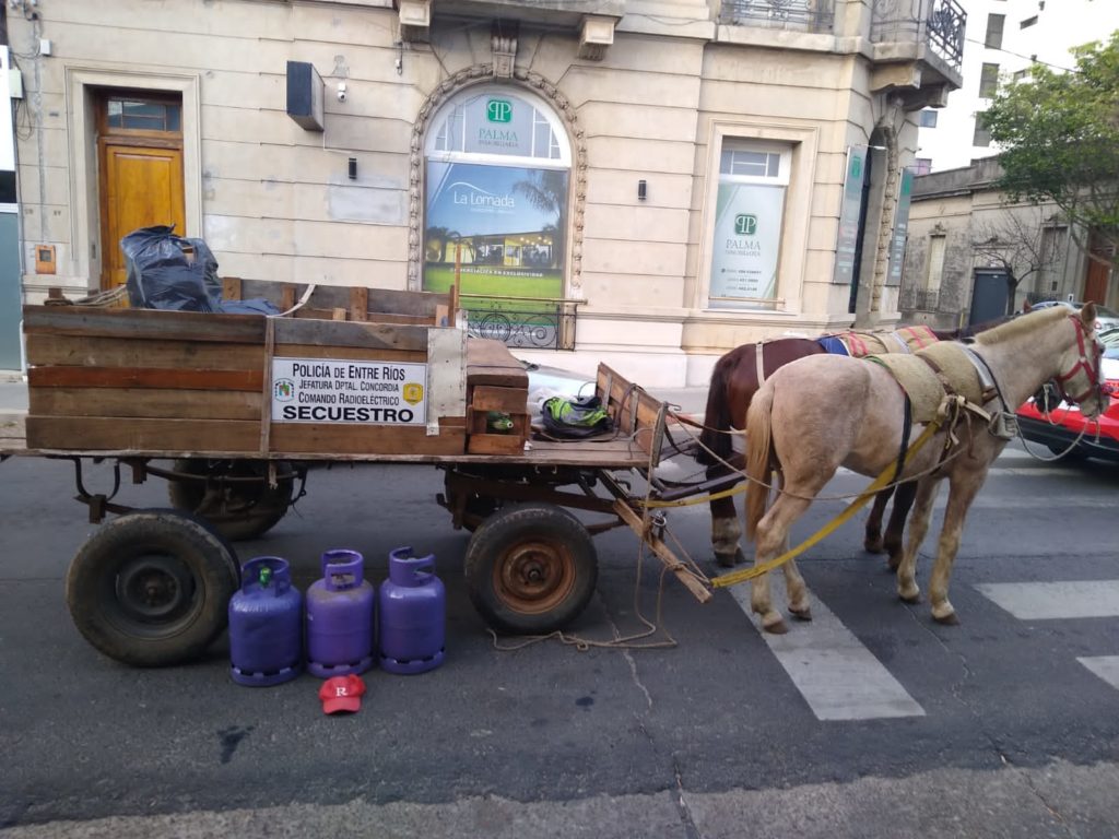 En la fecha siendo las 07:00 horas aprox., personal del comando radioeléctrico, intercepto en calle Urquiza y Estrada a un masculino de 42 años, que se conducía en un carro a tracción a sangre, transportando tres garrafas de 10kg, envase de color violeta, dos de ellas con su respectivo envoltorio de seguridad (nuevas).-