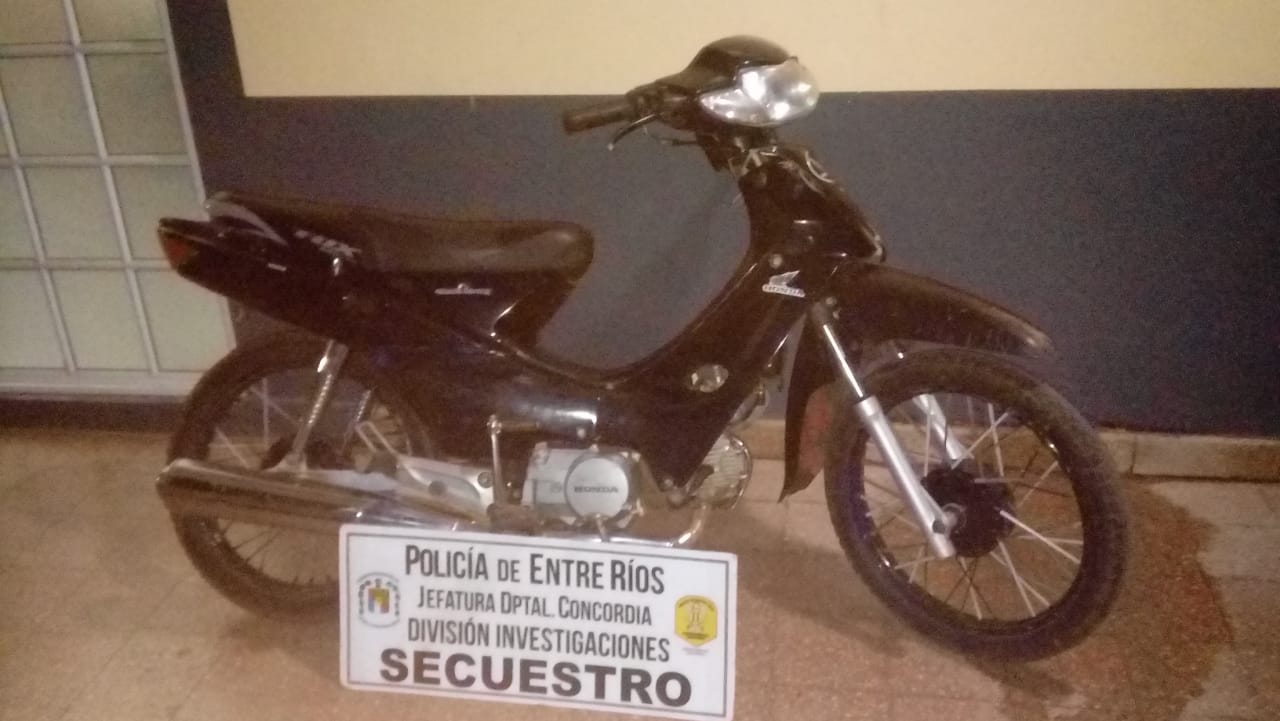 Personal de la división Investigaciones, anoche, secuestró una moto HONDA WAVE 110 cc, en relación con actuaciones instruidas en la Sección Judiciales, de  Jefatura Concordia, causa/ SUP. ROBO, de fecha 24/08/2017. Estaba en poder de un ciudadano de 33 años, quien entrego el rodado y documentación en forma voluntaria.  Se dio intervención al verificador, quedando dicho rodado depositado en sede policial a disposición de la autoridad judicial requirente.