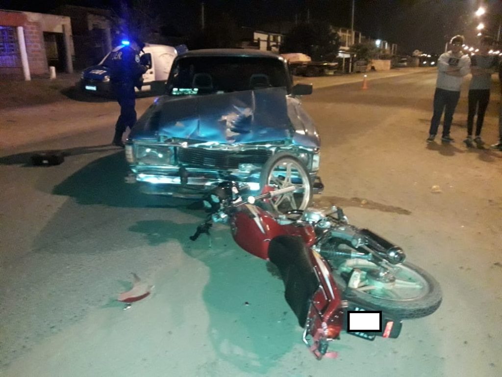 Personal de comisaria octava siendo las 00:30 horas toma intervención en un accidente de transito ocurrido en la Avenida Arturo Illia y Vera Peñaloza, entre un automóvil, Ford Falcón, conducido por un ciudadano de 27 años y una motocicleta marca Zanella 125cc., color roja, conducida por un masculino de 39 años.- El automotor circulaba por la avenida en dirección este-oeste y al intentar girar hacia el sur por calle vera Peñaloza impacta con la motocicleta que circulaba en dirección contraria.- Intervino la División Criminalística.-