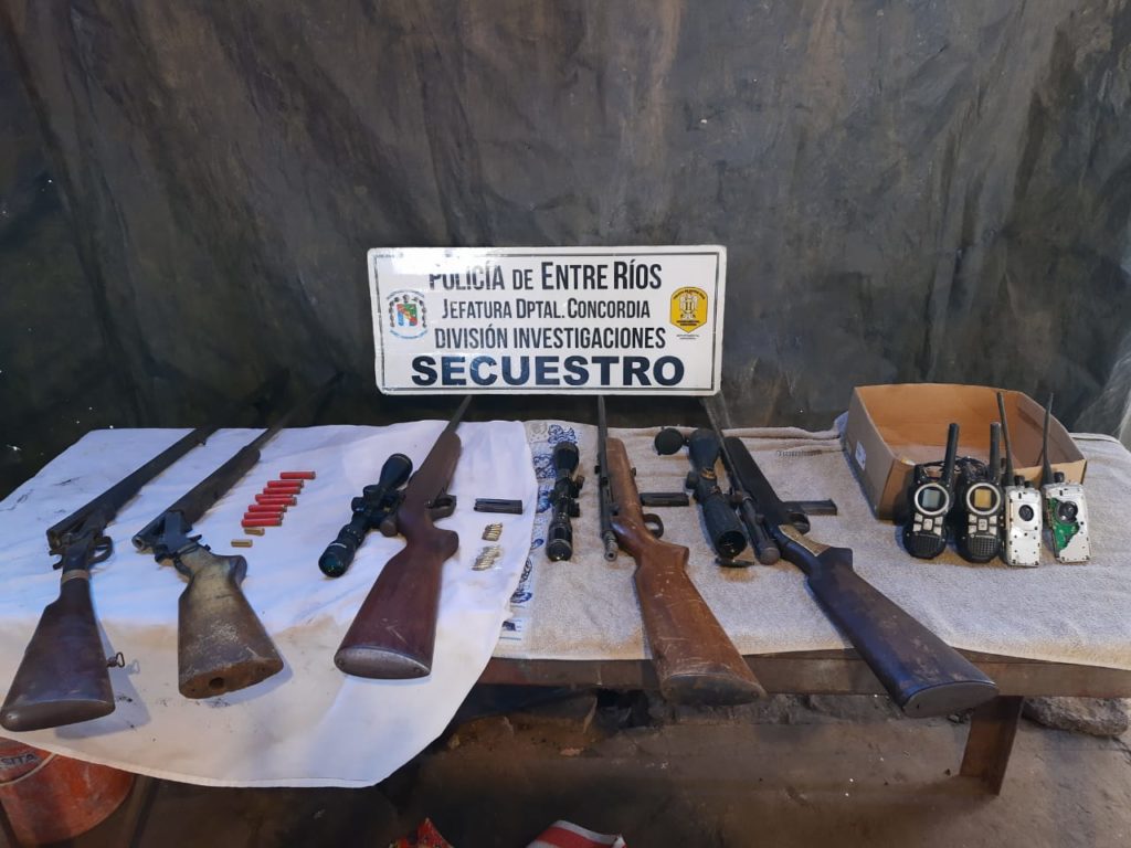 Personal de la división Investigaciones, en el dia de ayer, realizó allanamiento en el marco de causa por Robo de vehículo en la vida pública. El procedimiento se efectuó en una vivienda en zona de ingreso a Concordia, sobre la autovía, donde se procedió al formal secuestro de: dos escopetas, tres carabinas, dos miras telescópicas, cartuchería, dos vainas servidas y cuatro equipos de comunicación portátiles marca Motorola. Asimismo se procedió a la aprehensión de una persona de sexo masculino mayor de edad, por infracción a Art. 189 del Código Penal Argentino.-Tenencia Ilegal de Armas de Fuego.