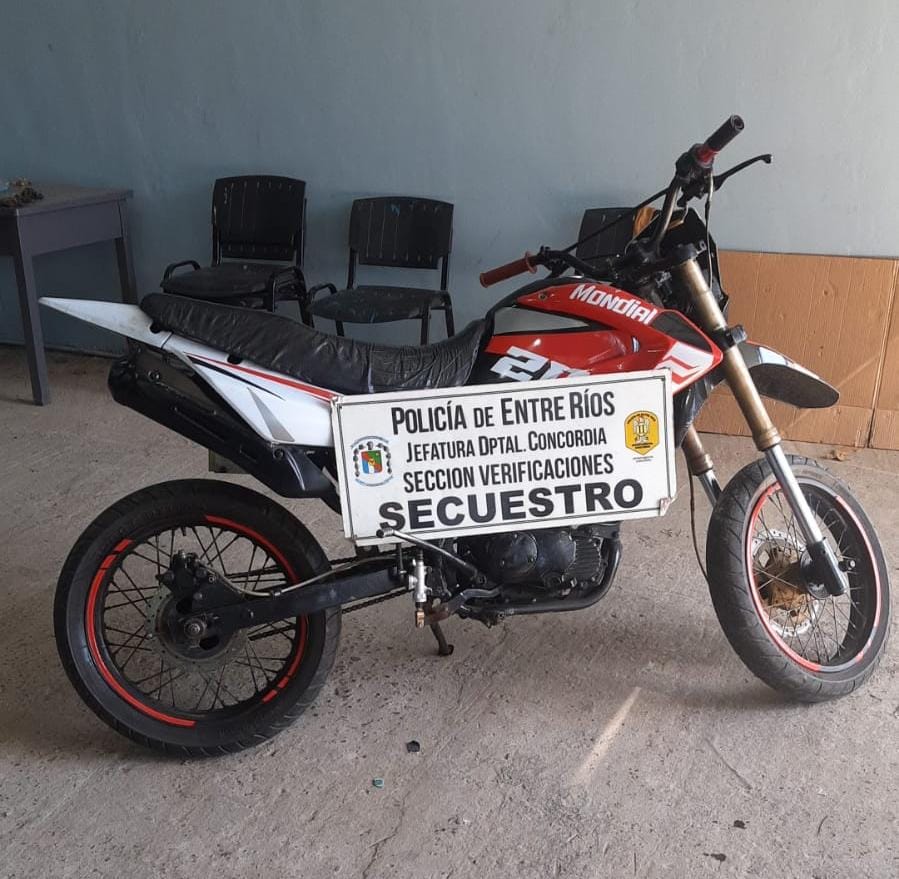 SECUESTRO DE MOTOVEHÍCULO: En el día de ayer a las 11:30 hs. personal de la División Investigaciones interviene en la Sección Verificaciones y proceden al Secuestro de (01) UN MOTOVEHICULO MARCA MONDIAL, COLOR NEGRO y ROJO, MODELO RD200K, la que posee varias soldaduras y modificaciones en las partes estructurales del cuadro, también sobre la numeración no declaradas. Que ante estas anomalías se identifica a su propietario y se inician actuaciones por la Supuesta Infracción al Art. 289° Inc) 3° del C.P.A.-