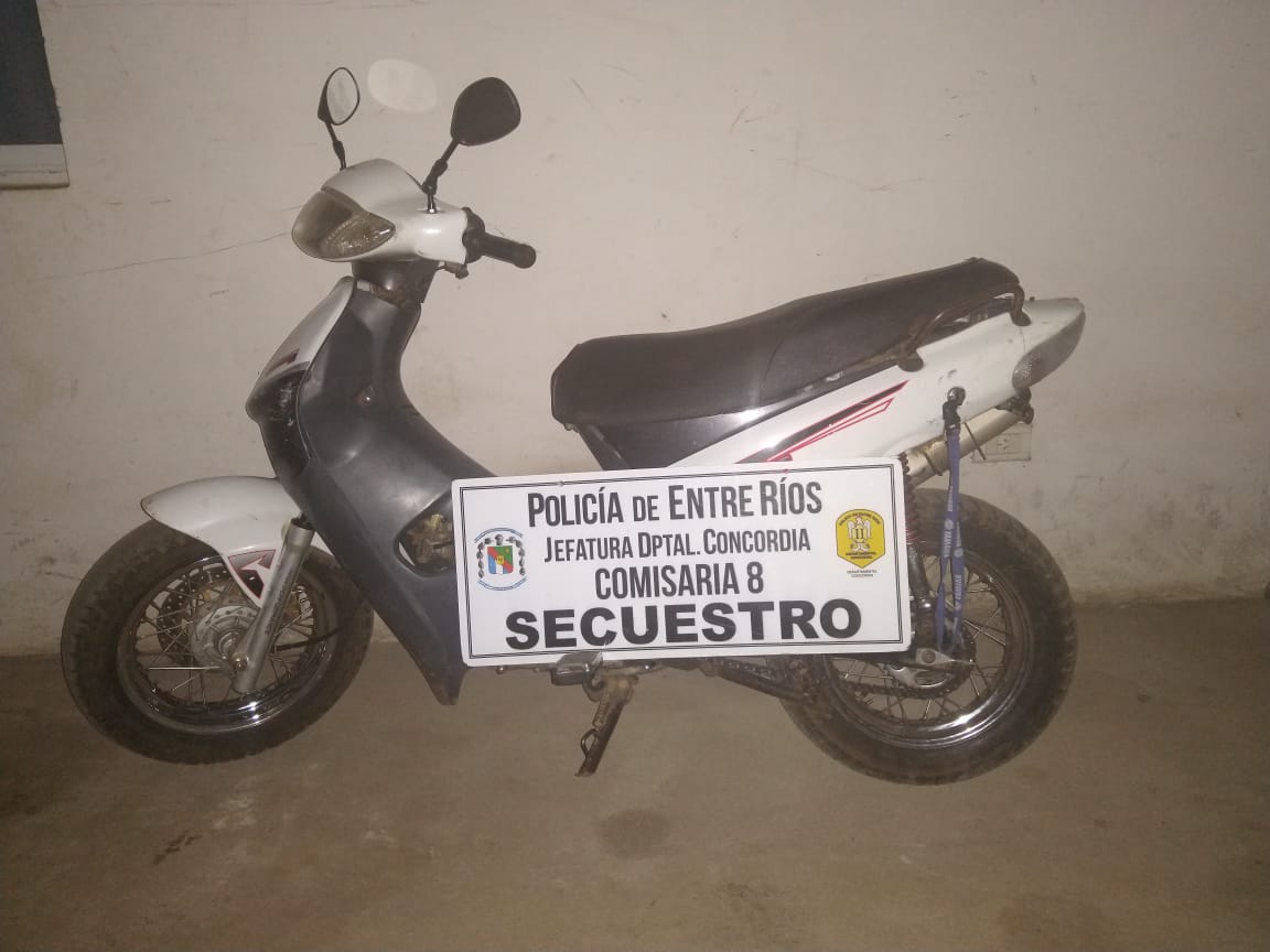 Personal de  comisaria Octava, en la víspera, siendo las 19:50 horas, en calles Maestra López y Moulins, secuestró una moto  CORVEN ENERGY de 110 cilindradas , conducida por un joven de 17 años. Al ser controlado el motovehículo,  registró  pedido de secuestro por denuncia de fecha 17/05/19, por supuesto delito de Hurto. EL fiscal de turno dispuso el secuestro de la moto e identificación del menor y entrega a sus padres.