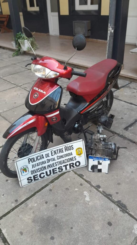 Personal policial de la División Investigaciones en la mañana de hoy, luego de  realizar un control de rutina en varios talleres de Moto-vehículos, logran verificar que en uno de ellos, ubicado en Calle Villaguay al 1500 aproximadamente,  había  una motocicleta, marca GILERA-Smash de color roja, 110cc., sin dominio colocado, la cual, tenía un motor que no se correspondía con dicho rodado. En dicho taller, también se encontró una chapa patente perteneciente a otro rodado con Pedido de Secuestro y un Motor que también presentaba un Pedido de Secuestro. Seguidamente se mantiene comunicación con la Unidad Fiscal en Turno y se dispone el SECUESTRO de dichos elementos y la identificación de los ocupantes del taller. Todos elementos que se integran a la presente investigación.