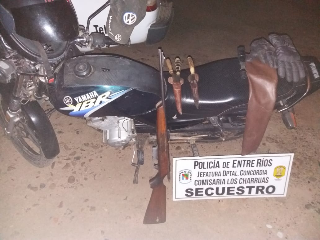 En horas de esta madrugada Personal Policial de la Brigada de Abigeato se constituyó en una finca de zona rural El carancho, Estancia “Los Álamos” ubicada en la Ruta Provincial Nº4 a la altura del Km8, cercanías de la Ruta 28, debido a que en el lugar se escuchaban detonaciones de arma de fuego, según lo manifestado por el propietario de la Estancia quien al escuchar los disparos y ver luces de linternas a la distancia desde su ventana llamó a la Policía, una vez en el lugar los Funcionarios encuentran una moto escondida entre la maleza, logrando también ver a dos personas que estaban con linternas y que luego éstos efectúan otro disparo al que de inmediato los Funcionarios le dan la voz de alto por lo que uno de los intrusos se arroja al suelo y el segundo se da a la fuga para luego ser alcanzado. Una vez averiguado por sus datos resultaron ser dos jóvenes de 18 y 21 años de la Localidad de Los Charrúas, se pudo secuestrar en el lugar luego de un rastrillaje elementos que estaban escondidos entre pastizales, siendo los mismos: (01) mochila de tela color negra, con funda de arma de hombro de símil cuero marrón, (02) cuchillos con vaina y chaira, (02) linternas, (01) carabina mono tiro con cerrojo y (01) bolsa de nylon con cartuchería calibre .22, encontrando dicho armamento con vaina servida en recámara. Se comunica al Fiscal en turno Dr. Arias quien dispuso la aprehensión y traslados de estas dos personas a Alcaldía, por el supuesto delito de abigeato, y el secuestro de la totalidad de los elementos.-