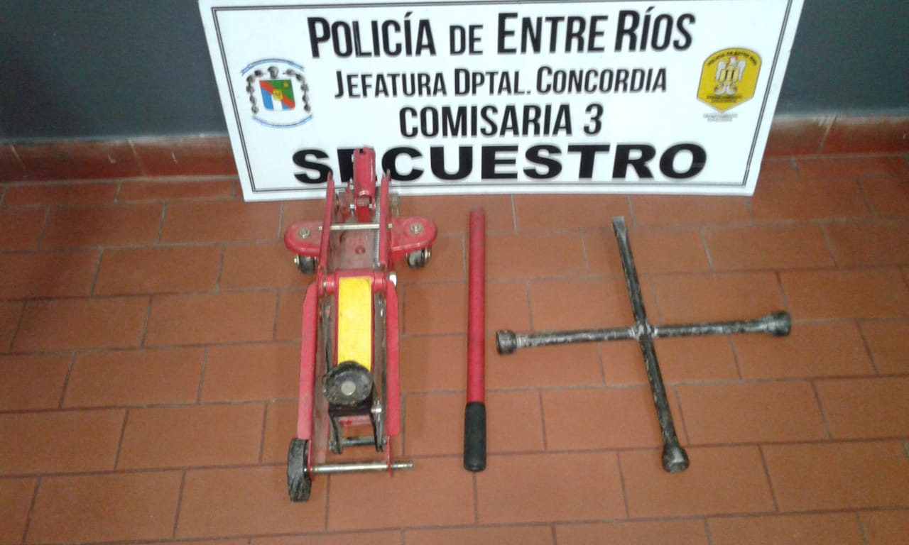 arroja los elementos que llevaba y se da a la fuga.- Observando los elementos arrojados siendo estos un gato hidráulico de color rojo y una llave cruz de color plateada.- En ese momento se hace presente un ciudadano de 56 años, manifestando que “el gordo” le habría sustraído elementos del interior de su camioneta marca VW Modelo Saveiro.- El damnificado radico denuncia.- Se secuestraron los elementos mencionados y posteriormente son entregados al dueño por disposición del Fiscal en turno.-