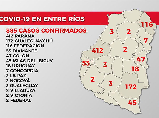Los primeros 16 fueron detectados en el Departamento Paraná: 13 de ellos pertenecen a la ciudad capital, de los cuales siete tuvieron contacto estrecho con casos Covid-19 confirmados con anterioridad, y los otros seis sus respectivos nexos epidemiológicos se encuentran en estudio. Otros dos pertenecen a la localidad de San Benito, uno está relacionado con otro paciente confirmado con Covid-19 y el restante su nexo se encuentra en estudio. El último fue confirmado en Colonia Avellaneda y su nexo epidemiológico se encuentra en investigación.