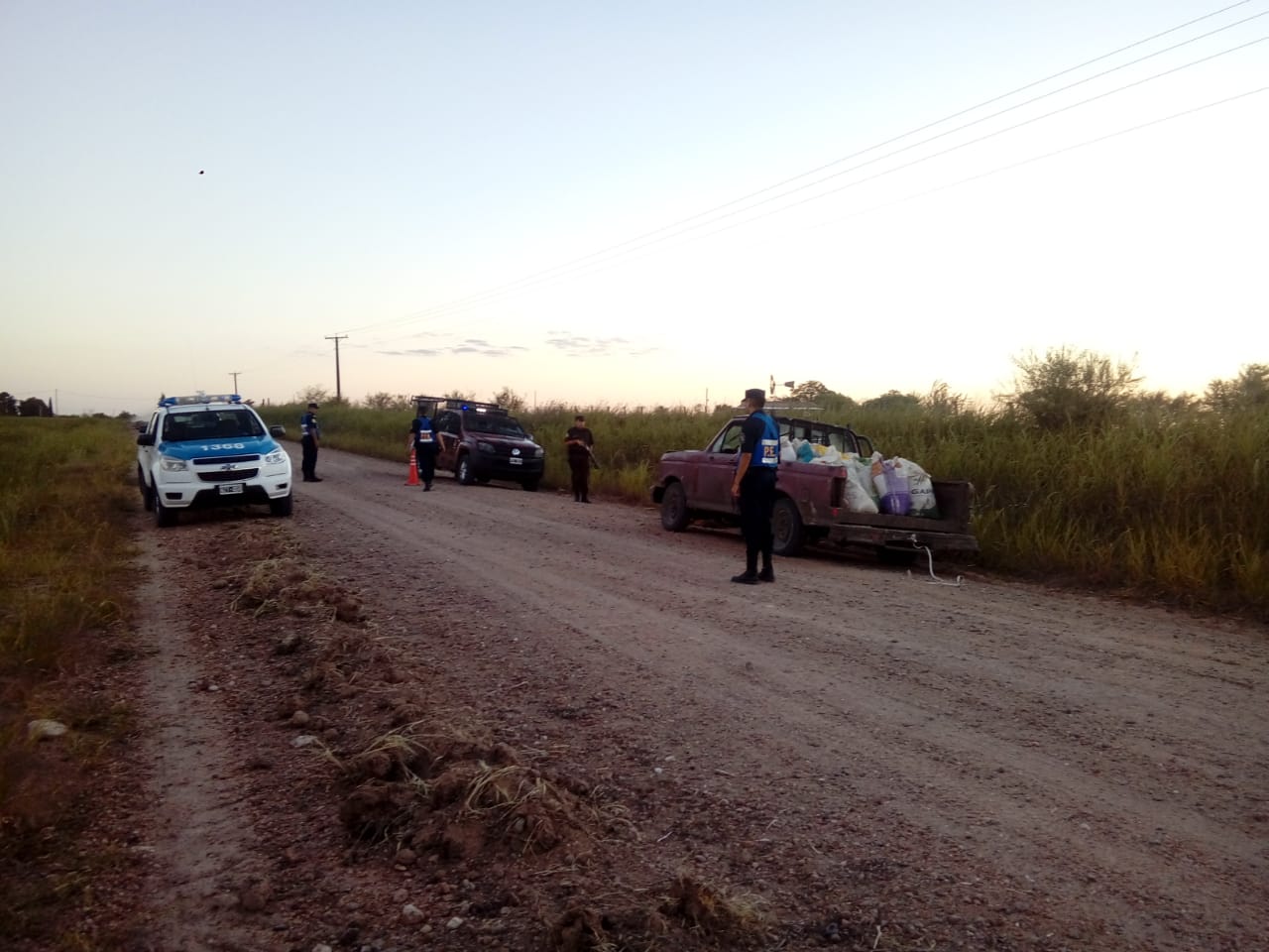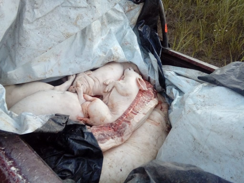 Ante tal situación se implementa un operativo en conjunto donde intervienen personal policial de la Comisaria Primera, Segunda, Comando Radioeléctrico y Grupo Especial, obteniendo como resultado a los pocos minutos y por la ruta mencionada, la localización del vehículo interesado, identificándose del interior de la misma a dos personas mayores de edad (63 y 22 años), los cuales transportaban en la caja de carga de la pick up, junto con bolsas de arpilleras y tapados con un nylon, un total de cinco (05) lechones enteros eviscerados y cuatro (04) medias reses de chancho, según se pudo establecer eran transportados por orden de su dueño hacia un comercio local.