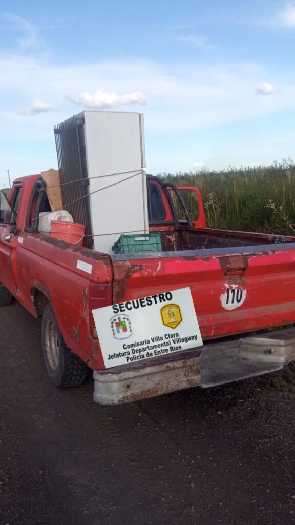 En horas de la tarde de este sábado 05 de Diciembre del corriente año, Personal Policial perteneciente a Comisaria Villa Clara a raíz de haber recibido un llamado donde informan que sobre un camino vecinal cercano a ruta Provincial N° 18 habría una camioneta con dos masculinos en ella, de color roja con una heladera blanca en situación sospechosa y uno de ellos habría bajado de la misma vistiendo musculosa oscura, bermuda y gorra; se dirigen al lugar con colaboración de la Sección Guardia Especial y Comisaria de Jubileo interceptando al vehículo siendo este una Camioneta Marca Ford de Color antes mencionado, conducida por dos masculinos, los cuales carecían de documentación del rodado y observando los alrededores se ven caños de arroceras, una rueda antigua y un molinete de cosechadora;
