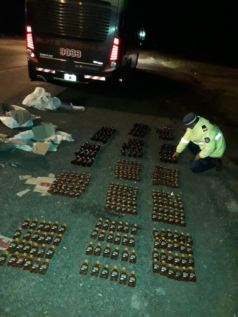 Con motivo de los Operativos de control integral y de prevención publica que viene realizando la Dirección de Prevención y Seguridad Vial en todas las rutas Entrerrianas, de acuerdo a los lineamientos establecidos por el Ministerio de Gobierno de la Provincia y el comando Superior de la Institución a cargo del Crio. Gral. Gustavo Maslein. En este caso en el puesto caminero Paso Cerrito ubicado en la autovía Gral. Artiga, (ruta Nacional 14 ) limite norte con la Provincia de Corrientes, siendo las 01:40 hs aproximadamente, personal policial, detiene la marcha, un micro que circula de norte hacia el Sur, de la empresa Flechabus, marca Scania, modelo K380, interno 9033, , con origen de la Pcia de Formosa y destino Bs As. Ahora bien, en circunstancias de realizar constante control sobre pasajeros y carga, con el can Jana, entrenada para la búsqueda de sustancias prohibidas, se observa en la zona de la baulera, tres bolsas grandes tipo alpilleras de color blanca conteniendo en su interior cajas la cuales contenían botellas de vidrios y plásticas, comprobándose que se trataba de bebidas alcohólicas con etiqueta que se denominaba CAÑA FINA ETIQUETA NEGRA TRES LEONES- CAÑA PARAGUAYA. Consultado al chofer, manifiesta ser mercadería de encomienda, por lo cual carecía de documentación, y teniéndose en cuenta que ningún pasajero viajaba a cargo de las mismas. Se procede a informar dicha novedad a la secretaria del juzgado Federal de Concepción del Uruguay, quien luego de anoticiado el Juez Federal dispuso que se actúe conforme al art. 230 bis, procediéndose al formal secuestro por infracción al Código Aduanero. Contabilizándose 08 cajas con 24 botellas chicas de plástico cada una, en un total de 192 botellas, 06 cajas con 12 botellas de vidrio cada una, siendo un total de 72 de las cuales 04 se encuentra destruidas. Finalizadas las diligencias, el transporte de pasajeros continua a destino.
