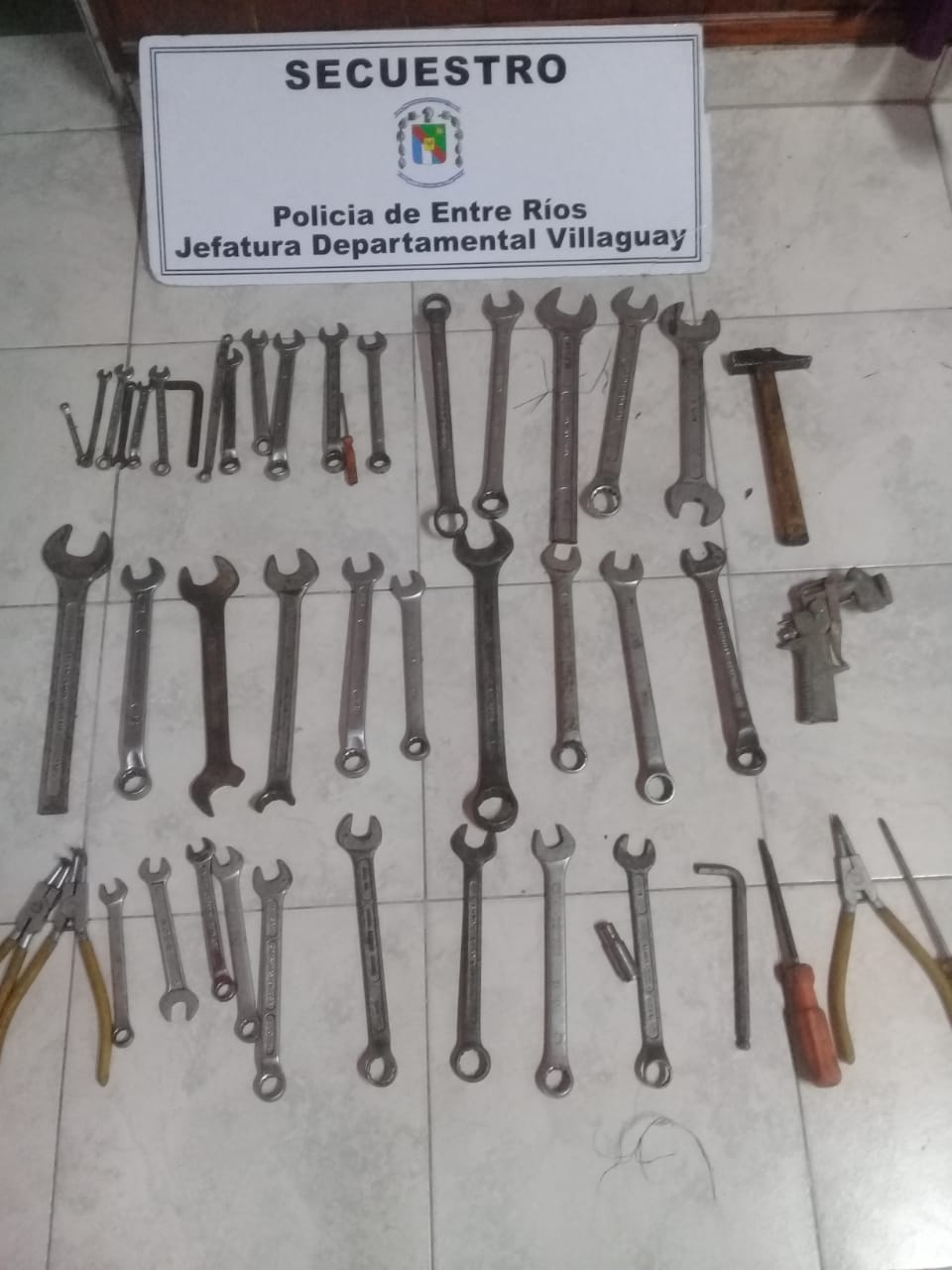 En relación a causa iniciada en Comisaría Segunda por el supuesto delito de Hurto en perjuicio de un vecino de calle Castello, personal policial de la División Investigaciones secuestró treinta y cinco llaves de mano combinadas de boca y estrías de diferentes marcas, tamaños y medidas, tres pinzas Seeger, un martillo, dos destornilladores y una pistola de pintar. Dichos elementos fueron encontrados en un terreno baldío situado en calle Ventavoli entre Bolívar y Velez Sarfield.-
