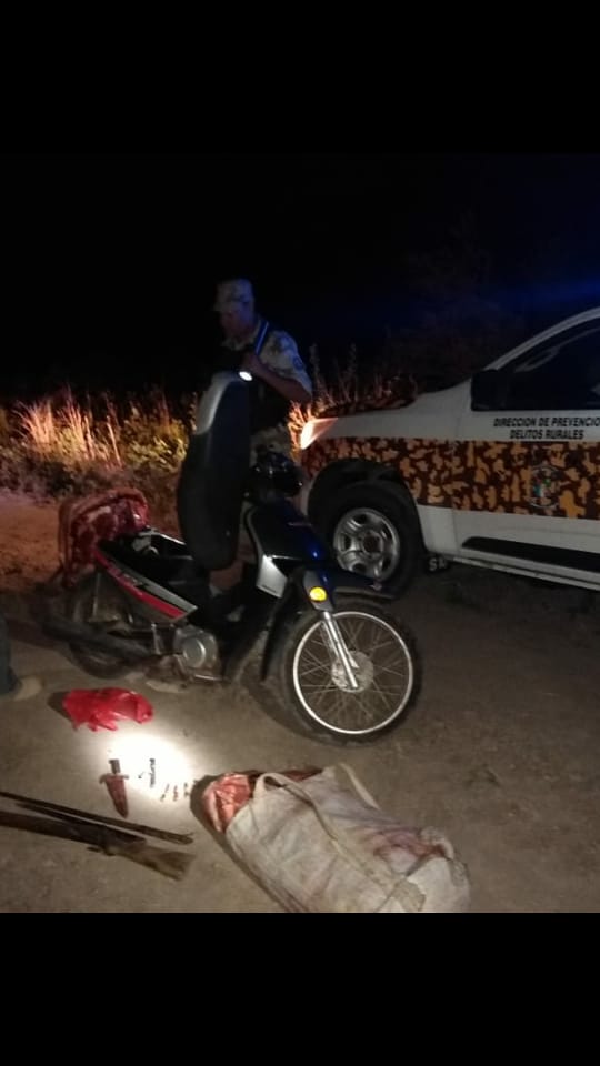 Esta madrugada personal de abigeato de feliciano, alrededor de las 03.00 hs. En zona de portón colorado, zona del distrito Basualdo. Observaron luces de una moto que se dirigía desde el norte, de zona del paraje rincón de mesa. Al int3ntsr pararl su marcha el acompañante, ase baja de la moto arroja un a4ma y se da a la fija en el monte de la zona sin poder ser alcanzado, logrando la aprehensión del conductor, un reconocido personaje del ambiente delictivo igual al otro que se dio a la fuga, al revisar la Bolsa que transportaban se constata carne de un animal vacuno ) y dos armas largas de fuego, se dio conocimiento al fiscal de turno quien dispuso quede detenido y alojado en la Dptal Feliciano, posteriormente los brigadistas y empleado de una Estancia logran localizar el semoviente caemeadas muerto de por un proyectil. Se conservó que sólo se llevaron pillas del vacuno. Quedando los restos, también se dio intervención a la Div. Criminalista, del delincuente de 29 años Queda detenido por supuesto delito de Abigeato en flagrancia. Se secuestro *la motocicleta, carne, dos armas de fuego sin documentación, teléfono celular, prendas de vestir con manchas de sangre y cuchillo con manchas de sangre*. Posteriormente se recepciono denuncia al al damnificado Por la carneada de un animal vacuno.