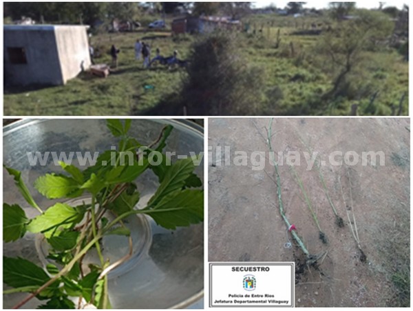 Como consecuencia pasado el mediodía se llevó a cabo allanamiento y registro domiciliario en dos viviendas de la ciudad, mediante oficio judicial librado por el Juzgado local donde se procedió al secuestro de elementos de interés para la causa entre ellos un cuchillo hoja de metal y cabo de madera como así también ropa de vestir por parte de la División Investigaciones; cuatro plantas de cannabis sativa (sin hojas) y ocho plantines de la misma especie quedando al resguardo de la División Toxicología.
