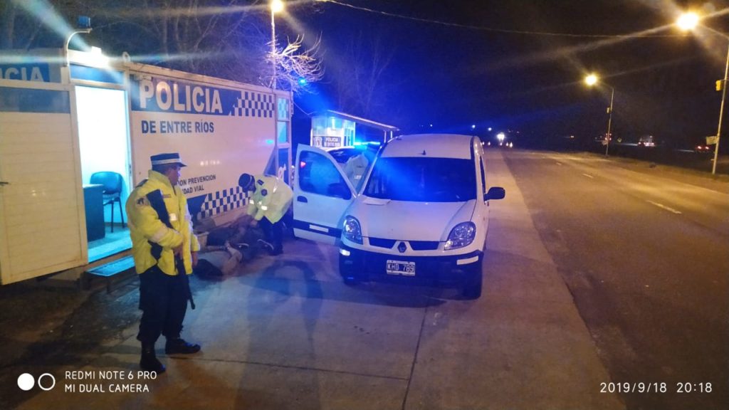 Siendo las 20:00 horas de la víspera , en virtud de localizaci ón irradiada por Cría. 1º de Chajarí donde solicita la localización de vehículo RENAULT KANGOO, color blanco, dominio parcial 789, donde se conducían dos masculinos que habrían cometido «un cuento del tío» apoderándose de $10.000, en el puesto caminero bella vista se logra detener la marcha de vehículo RENAULT KANGOO dominio colocado KHD789, color blanco, donde se conducen tres masculinos, uno de ellos con las características irradiadas. Se puso en conocimiento a las autoridades judiciales de competencia desarrollándose el procedimiento respectivo el cual arrojó resultado positivo hallandose elementos interesados, secuestro del ultilitario y detención de los tres masculinos los mismos oriundos de Merlo y gral Rodríguez pcia de bs as.
