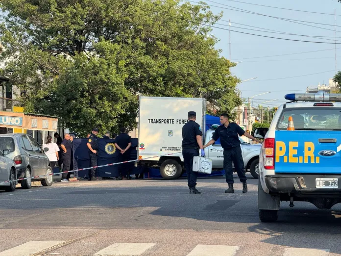 El automóvil Peugeot 206 rojo permanecía estacionado sobre calle Gualeguaychú y fue cubierto por un amplio operativo policial para preservar la escena a fin de determinar formas y circunstancias de los hechos.