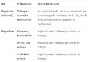 La suscripción de estos documentos se habría realizado en julio de 2025. Sin embargo, la entrega de la vivienda, ubicada en el B° 300 Viviendas Manzana C casa 18, nunca se concretó, lo que disparó el conflicto legal.