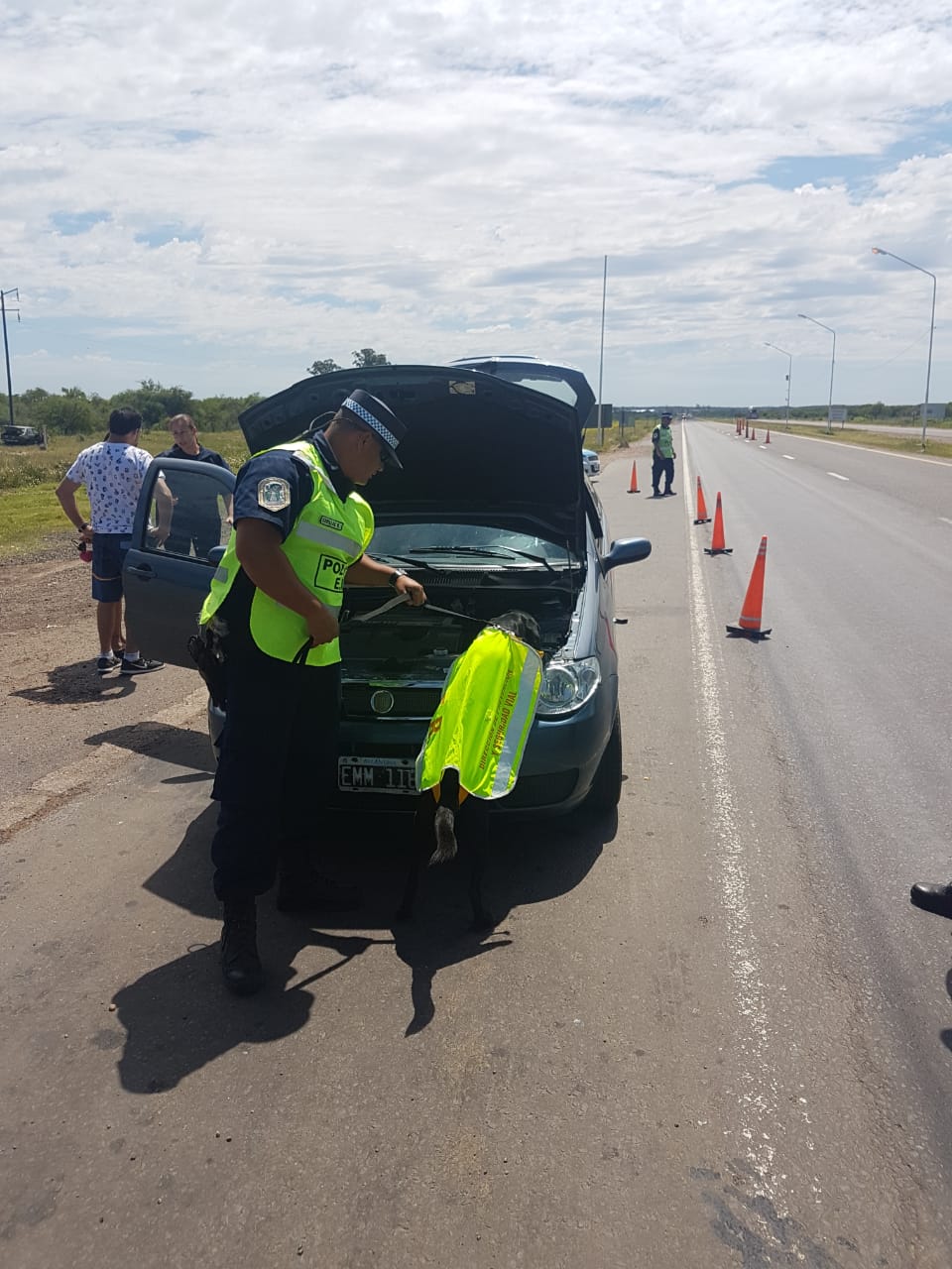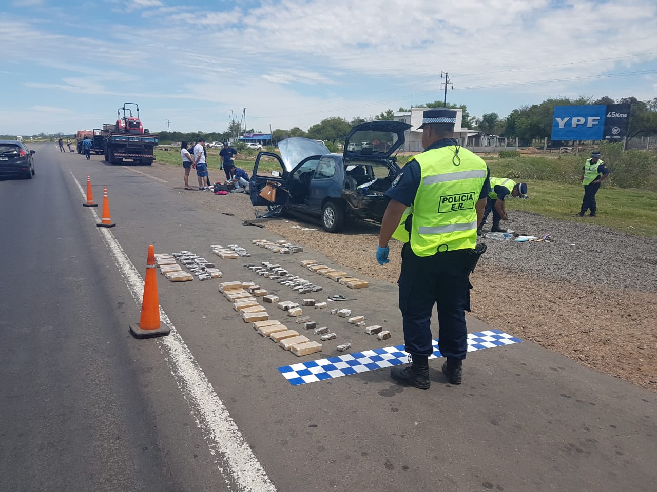a Policía de Entre Ríos a través de la Dirección de Prevención y Seguridad Vial localiza un cargamento de drogas en el puesto Caminero Paso Cerrito en la fecha siendo aproximadamente las 05.40 horas, personal apostado y abocado al permanente control vehicular frente a esta dependencia policial situada en Autovía Artigas -ruta nacional 14, km 341, carril con sentido de circulación de norte a sur, procede a hacer detener la marcha de un vehículo que ingresaba a nuestra provincia siendo un automóvil marca Fiat, modelo Palio, de color azul, 3 puertas, , el cual era conducido un masculino argentino, soltero, de 43 años de edad, dliado en Barrio Santa Clara III, de la localidad de Garupa, Misiones, teniendo como acompañante a una femenina argentina, soltera, de 18 años de edad, dliada en Barrio Santa Clara III, de la Localidad de Garupa, Misiones, y de 2 años de edad, Ante la requisitoria, el conductor exhibe su licencia de conducir y seguro, como así también la cédula del Automotor . Manifestando apuro el conductor para poder llegar a Buenos Aires a Saludar a su madre por el día especial. No obstante ello y como es de estilo en los operativos de Prevención Pública Continuando con un control más exhaustivo sobre el rodado con el can «Jana», quien inmediatamente cambia de actitud demostrando la posible presencia de alguna sustancia estupefaciente tanto en la parte delantera como trasera del mismo. Ante dicha presunción y al observar minuciosamente la parte de abajo (piso), se observa un corte y a través del mismo la presencia de bultos de color marrón al igual que en la parte delantera, más precisamente en el panel parallamas y en los paneles de las puertas falsas. Se le dio intervención al personal especializado quienes se comunicaron con la justicia federal de Concepción del Uruguay despidiéndose la requisa del vehículo. Encontrándose gran cantidad de panes envueltos en cinta color marrón siendo aparentemente marihuana. El procedimiento está en marcha en este momento se van sacando más de 100 entre panes y trozos pequeños.