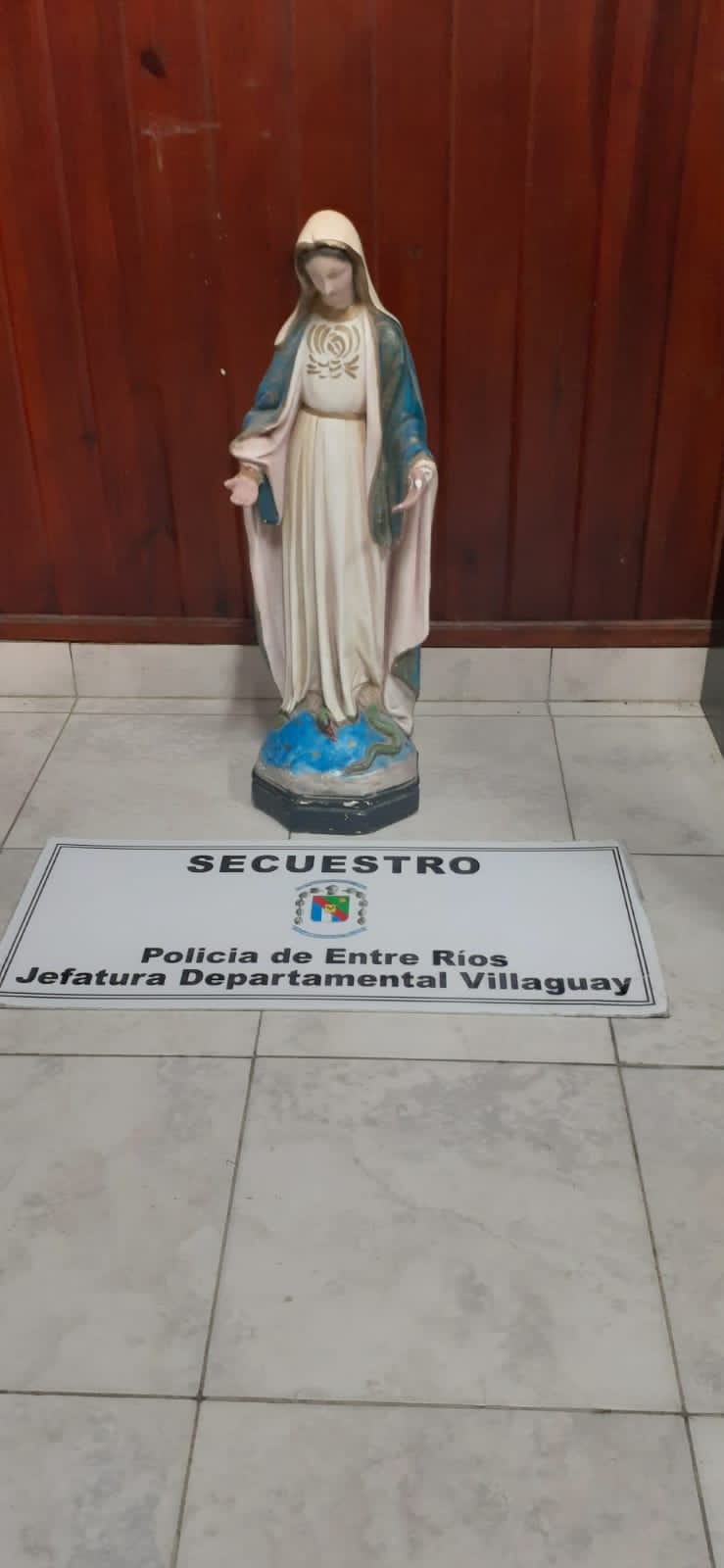 Consecuente a denuncia realizada en Comisaría Segunda en fecha 23 de agosto del corriente año, donde una mujer de 66 años de edad denunciara la faltante de la Imagen estatua de la Virgen de la Medalla Milagrosa del interior de la capilla situada en el Barrio Perpetuo Socorro, en la fecha personal policial de la División Investigaciones procedió al formal secuestro de la Imagen la que fuera entregada por un vecino de 69 años de edad.
