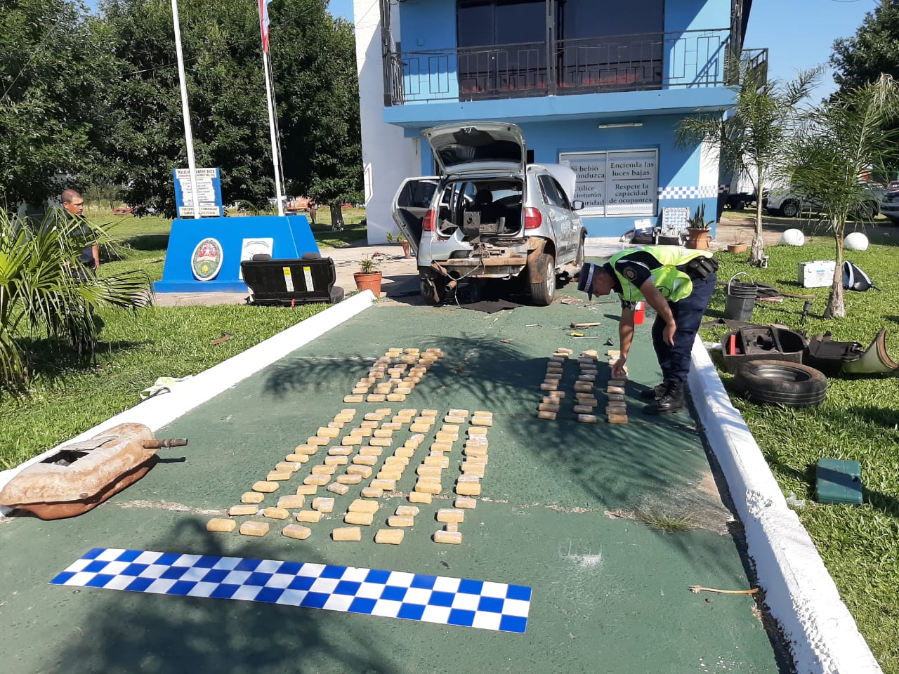 Luego de requerir la documentacion básica y necesaria, se les informa que se le realizará un control rutinario con el Can Jana, el cual al pasar por ambos socalos del vehículo, cambia rápidamente su actitud, haciendo notar que estaría en presencia de estupefacientes. Habiéndose dado intervención a la Dirección Toxicología y pleno conocimiento al juzgado Federal de Concepción del Uruguay se realizaron las requisas respectivas hallandose en el rodado la cantidad de 152 panes de cannabis sativa el cual arrojó un peso total de 30 kg 210 gramos. Se procedió al secuestro de la sustancia, el vehículo y la inmediata detención de los ocupantes de rodado.