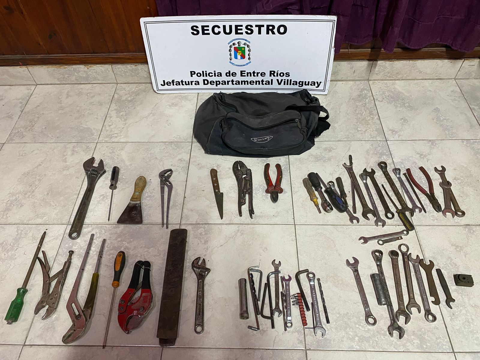 Relacionado a causa iniciada en horas de la mañana de este Martes 21 de febrero por parte de personal policial perteneciente a la División Investigaciones, se llevaron a cabo tareas investigativas para establecer real procedencia y propiedad de un bolso con varias herramientas de mano, el cual fue encontrado en un terreno baldío de la zona Norte de la ciudad, conteniendo en su interior dos llaves francesas, dos pinzas pico de loro, tres pinzas alicate de presión, dos pinzas tipo alicate de corte, dos corta fierros, seis destornilladores, cinco llaves tipo allen, tres mechas de taladro, dieciocho llaves de mano, un cuchillo con mango de madera, y un juego de puntas para destornillador; elementos que fueron formalmente secuestrados.