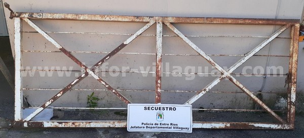 En la mañana de este sábado 06 de noviembre personal policial de la Jefatura Departamental Villaguay secuestró un portón de caño de 4 metros de largo. El mismo había sido denunciado como sustraído en Comisaría Segunda el pasado 04 de noviembre por un vecino de 56 años domiciliado en calle Castello. La investigación realizada por personal policial de la Sección Robos y Hurtos de la División Investigaciones culminó con la localización del elemento sustraído el cual se encontraba en una vivienda situada en calle Federick al Oeste.