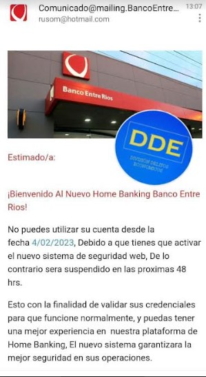 Habiendo tomado conocimiento de una nueva modalidad de estafa que se viene dando puntualmente en la Provincia de Entre Ríos desde los primeros días del mes de febrero de este año 2023, mediante la cual utilizando una imagen de Fantasía referente al NUEVO BANCO DE ENTRE RIOS, envían email a los clientes de dicha entidad bancaria a sus correos electrónicos desde casillas como rusom@hotmail.com o también Comunicado@mailing.BancoEntreRíos.Net  mediante los cuales hacen saber que su Homebanking ha sido bloqueado a raíz de un problema en particular, para lo cual deben ingresar a un link que se adjunta en el mismo correo el cual se lee como “ACTIVA EL NUEVO SISTEMA DE SEGURIDAD”, en el cual luego de ingresar les solicitan que ingresen datos personales y/o bancarios tales como numeración de las tarjetas de crédito y/o debito a los fines de poder regularizar la situación y poder asignar una contraseña nueva pero, haciendo lo antes mencionado lo único que se está haciendo es brindar a los estafadores datos personales que le sirven a ellos para ingresar a la cuenta del usuario y transferirle el dinero que posee en su cuenta u otras propia de ellos, como así también la posibilidad de sacar un crédito mientras operan con la cuenta.