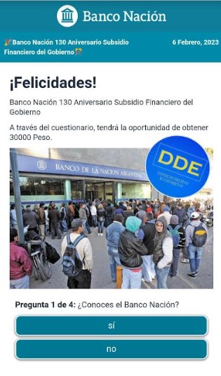 utilizando una imagen del Banco Nacion, se comunican con las personas que completaron ese formulario para hacerles saber que han sido beneficiados con dicho subsidio, para lo cual deben dirigirse a un cajero automatico mas cercano para que los guien con los pasos a seguir y de esa manera depositarles el dinero, lo cual es totalmente falso porque lo unio que van a lograr a travez de un engaño es lograr que las víctimas pasen sin darse cuenta la clave TOKEN a los estafadores y de esa forma ellos pueden ingresar a sus cuentas bancarias y sacarles eld inero que tengan en sus cuentas o bien solicitarles un prestamo, como se describia en la situación anterior.