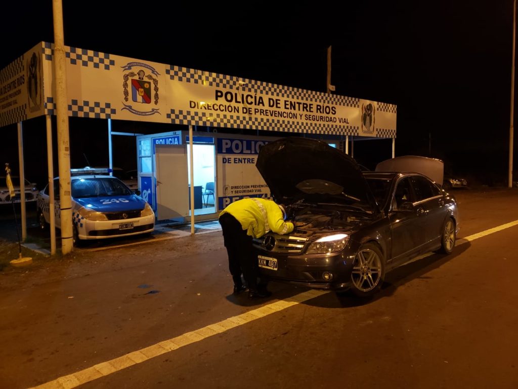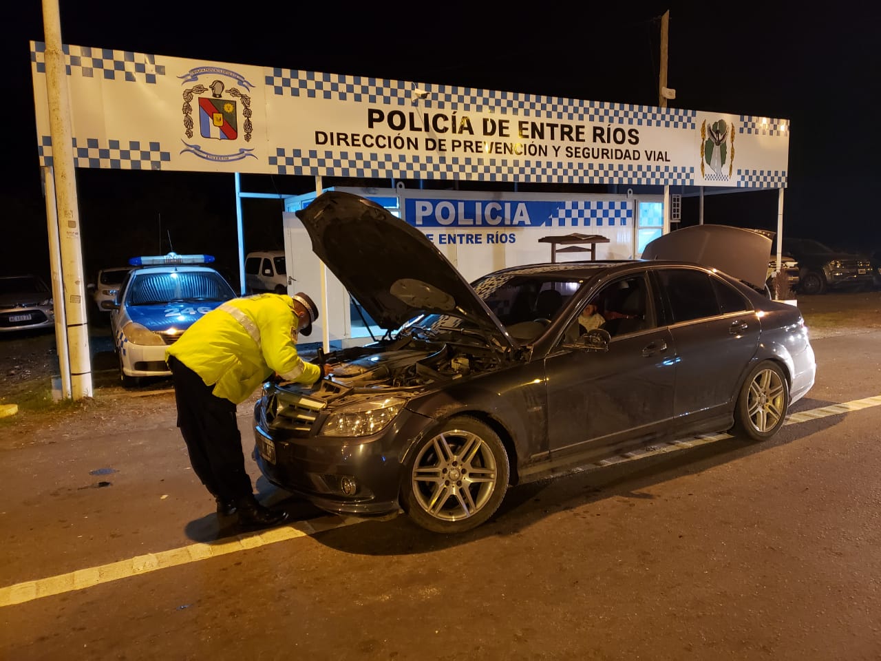 LA Dirección de Prevención y Seguridad Vial, de la Policía de Entre Ríos en el marco de los Operativos de Prevención Publica dispuestos en el ámbito de toda la provincia, en este caso el puesto caminero Islas sito en ruta Nacional 12 Km 119 siendo las 23:00 horas se detiene la marcha de un vehículo marca Mercedes Benz modelo C 250, color gris oscuro, dominio colocado KKM-487, que circulaba en sentido Sur-Norte, conducido por el ciudadano de 24 años de edad, domiciliado en, el partido de Pinamar, Bs.As, de nacionalidad paraguaya, al requerírsele la documentación de rigor este exhibe una cédula de identificación de vehículos siendo su titular Uriarte E. y con una cédula de identificación de vehículos para autorizados a su nombre, elementos éstos con evidentes signos de ser apócrifos, seguidamente se procede a verificar la numeración de chasis y motor los cuales se encuentran vinculados al dominio JWC-756, vehículo marca Mercedes Benz con pedido de secuestro vigente de fecha 10/01/2019, (ROBADO) seguidamente se anoticia al Fiscal en turno de Villa Paranacito a cargo del Dr OBAID PABLO quien dispuso el formal secuestro del rodado junto a la documentación presentada y la correcta identificación del conductor el cual quedará supeditado a la causa que se instruye.
