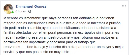 Mientras se encontraban fuera del Cuartel de Bomberos, brindando asistencia a familias de la ciudad, «personas sin escrúpulos sin importarles nada ni nadie ingresaron a nuestro cuartel y nos robaron una motosierra herramienta tan importante y necesaria para el trabajo que realizamos», indicó.