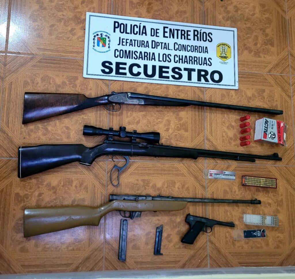 En relación a actuaciones iniciadas por DENUNCIA DE VIOLENCIA DE GENERO LEY 26.485, por parte de una femenina mayor de edad, domiciliada en esta localidad, donde la misma relataba sobre la situación de maltrato que había sufrido su hija menor de edad por parte de su padre y ex pareja de la denunciante, donde además dejaba aclarado en dicho formulario un par de situaciones de convivencia, donde La denunciante también había resultado maltratada hasta llegar al límite de sentirse amenazada por parte de su ex pareja quien empuñaba un arma de fuego con intenciones de querer quitarle la vida, es que personal de esta dependencia de comisaria Los Charruas, a cargo del jefe de la misma procedió a realizar tareas investigativas tendientes a esclarecer el presente hecho, siendo así que se realizó entrevistas a vecinos de esta localidad, el relación a la conducta del masculino, siendo una persona mayor de edad con domicilio en esta localidad, así también poder lograr la localización e individualización, ya que se desconocía el paradero del varonil en cuestión, siendo así que se pudo recabar datos de importancia para la investigación, volcándose todo tipo de conocimiento de las averiguaciones practicadas a las autoridades judiciales y de la plana mayor de la Jefatura de Policía Departamental Concordia, resultando así, que se procedió a solicitar orden de allanamiento y registro domiciliario para un establecimiento ubicado en Distrito El Redomon, siendo autorizado mediante mandamiento judicial N° 641 proveniente del juzgado de Garantías N° 4 a cargo del Dr. Dri German, arribando al lugar, hallándose a la persona denunciada, poniéndole en conocimiento y notificándosela de la correspondiente medida a llevar a cabo, arrojando estas resultado altamente positivo, procediéndose al formal secuestro de una pistola cal. 22 marca T.A.L.A, con cargado en parte inferior, un arma de fuego tipo Carabina Cal. 22 marca MAHELY, una escopeta Cal. 16 marca AYA AGUIRRE & ARANZABAL, un arma de fuego tipo rifle Cal. 22 color marrón cargador inferior marca SAURIO con mira telescópica parte superior, así también Dos cajas plásticas de cartuchos calibre .22 conteniendo más de un centenar de cartuchos y una caja de cartucho marca ACTIV Cal. 16/70. Se comunicó de todos los pormenores del procedimiento llevado a cabo a la fiscalía en turno, quien dispuso que se proceda a la detención del masculino, en contexto de violencia de Genero y por el delito de tenencia ilegal de arma de fuego, que ante ello se procedió al traslado hacia alcaidía policial de la ciudad de Concordia, lugar donde quedo alojado. Dicho Procedimiento estuvo a cargo del jefe de Comisaria Los Charruas Comisario Cepeda Pedro y personal a sus órdenes, prestando colaboración en el mismo personal de destacamento El Redomon.-.