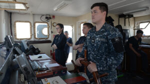 Como otra actividad de su Especialidad Naval de Mar, timonea la unidad de superficie y por las noches, cubre guardias en el Puente de Comando del buque, verificando que todo esté en orden.