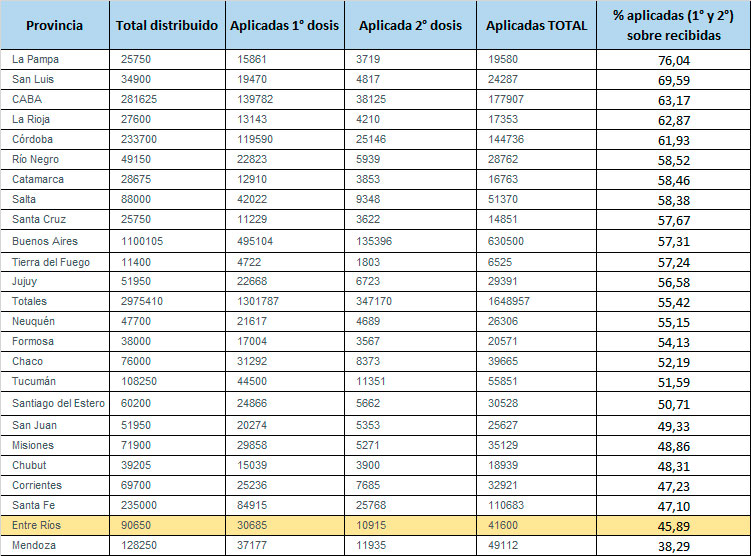 Entre Ríos se ubica en el anteúltimo lugar, ya que, según el Monitor Público, aplicó hasta el momento menos de la mitad de las dosis que le fueron entregadas. Más precisamente, el 45,89 %. Puesto en números, recibió 90.650 dosis en total y aplicó, hasta este martes por la mañana, 41.600.