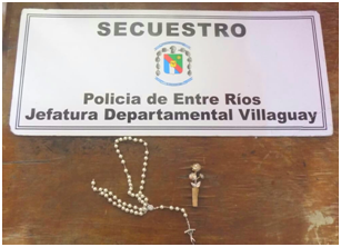 En horas tempranas de este jueves 03 de septiembre personal policial de la Jefatura Departamental Villaguay secuestró un crucifijo y un prendedor de rosas denunciados como sustraídos desde el interior de la Parroquia Santa Rosa de Lima.-
